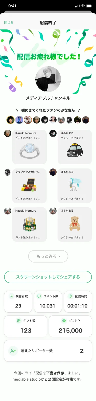 観に来てくれたファンやギフトの画面は『スクリーンショット』をして、mediable内のタイムライン機能やtwitter等のSNSでスクリーンショットを添付してお礼の気持ちを伝えると、