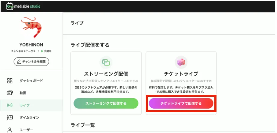 mediable studio左側のメニューの『ライブ』の『チケットライブ』を選択します。