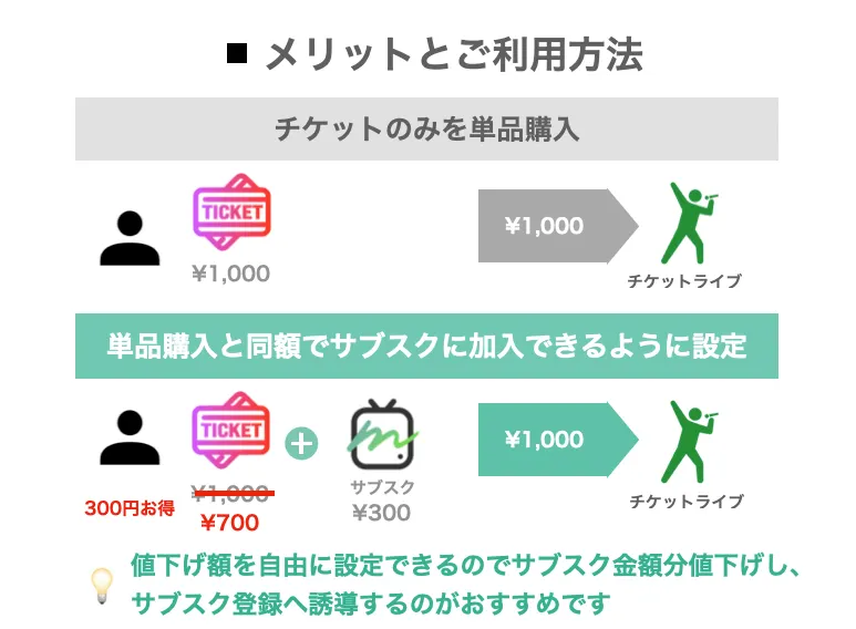 チケットの金額を”サブスク会員を対象に割引金額を自由に設定”できるので、