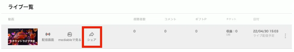 チケットを販売したいライブの『シェア』をクリックすると、配信画面・チケット購入画面のURLをコピーすることができます。