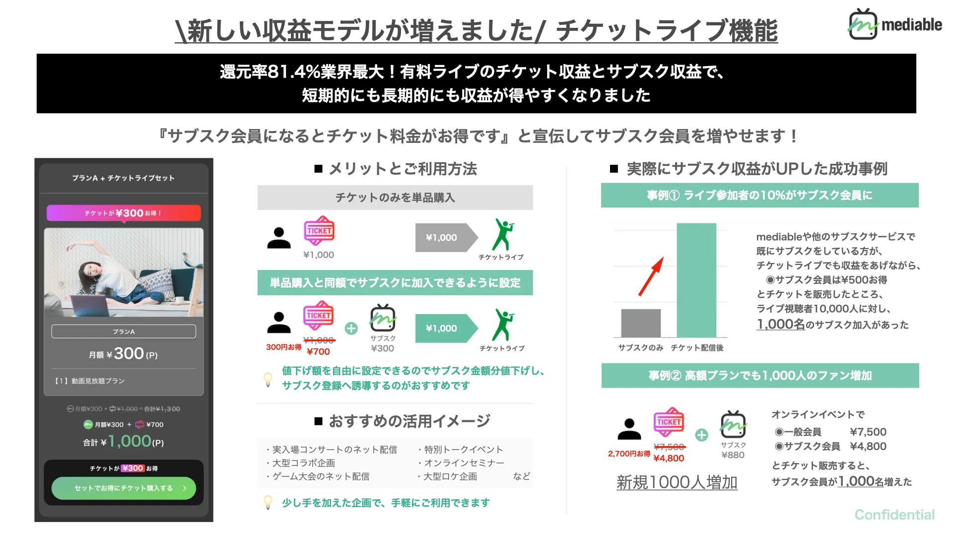 サポーター(月額課金者)からのサブスク収益や投げ銭以外にも、チケットライブで収益を得られます