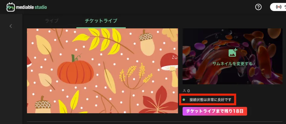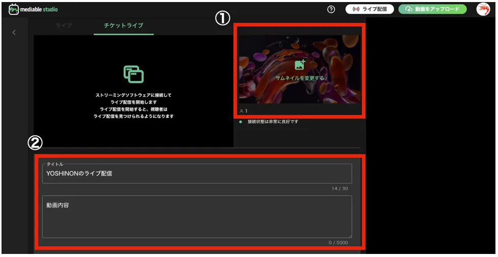 mediable studioの配信画面にOBSの画面が表示され、『接続状態は非常に良好です』になっているか確認