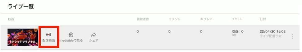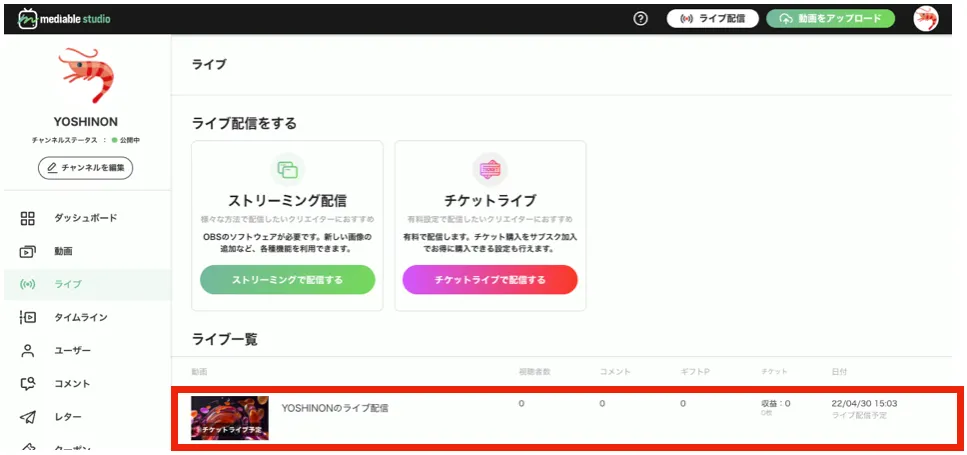 ライブ配信の予約が完了すると、mediable studio『ライブ』のライブ一覧に配信予定のライブが表示されます。