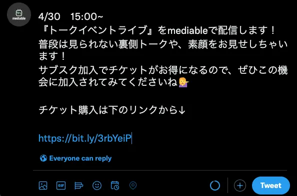 よりチケット購入される可能性が高くなりますので、ぜひファンの方にたくさん告知されてみてください。