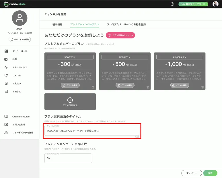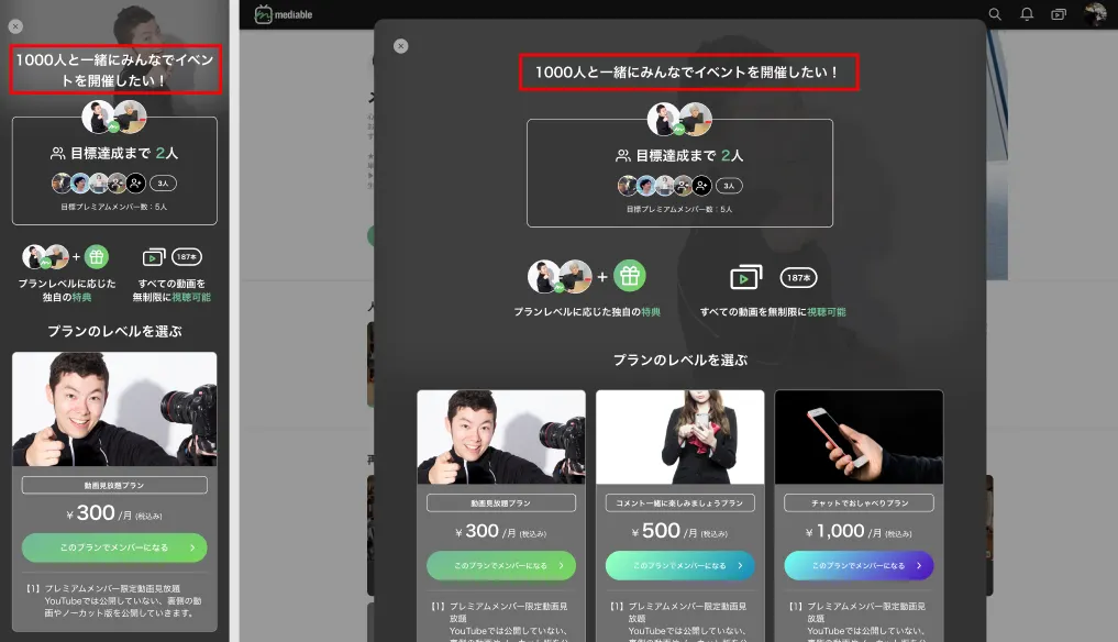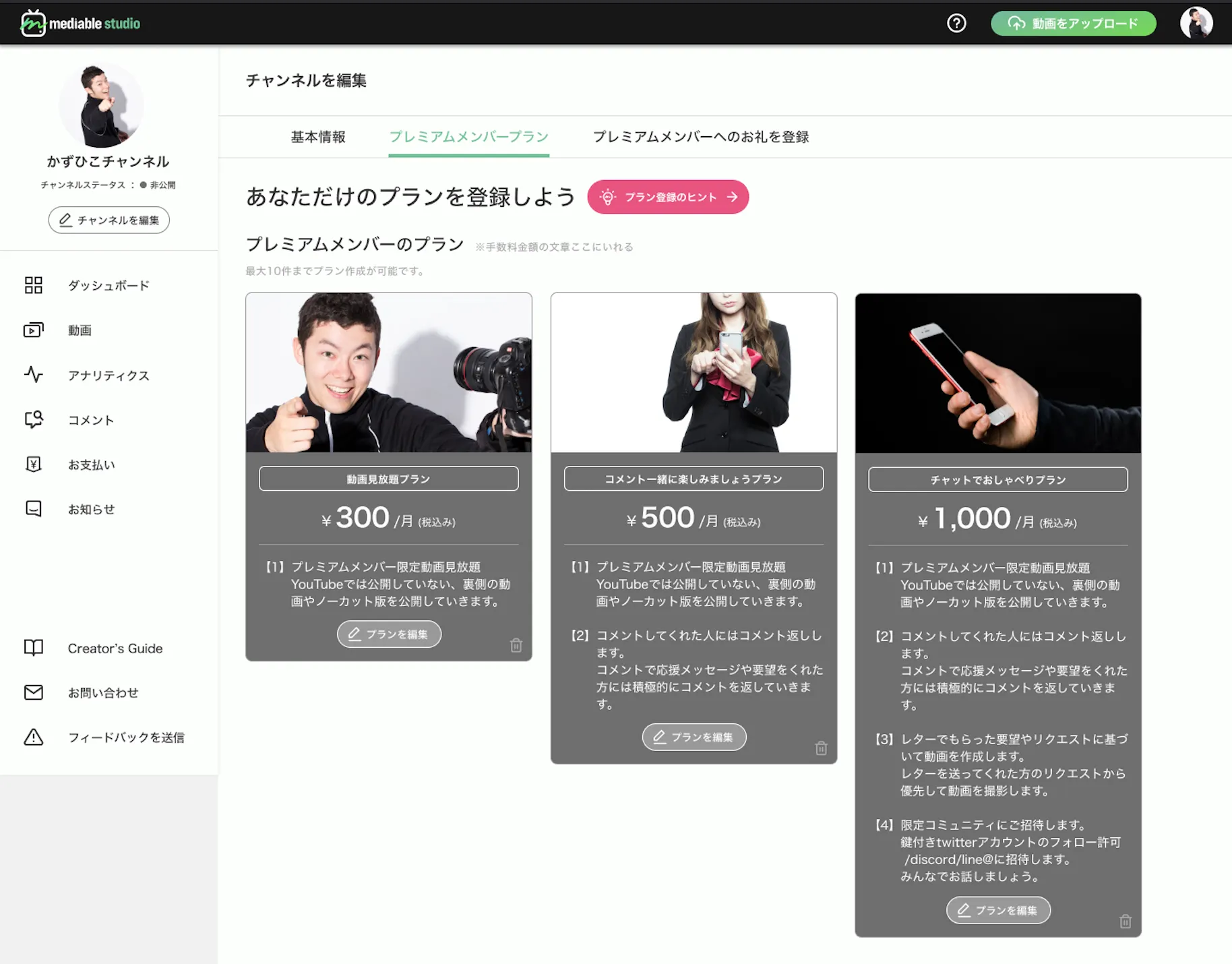 動画視聴以外に、限定グッズの販売だったり、コメントへ優先的に返信するだったり、1対1でのライブ配信を開催したり、などと自分のやりたいことや得意なことを活かして複数のプランを設定しましょう。