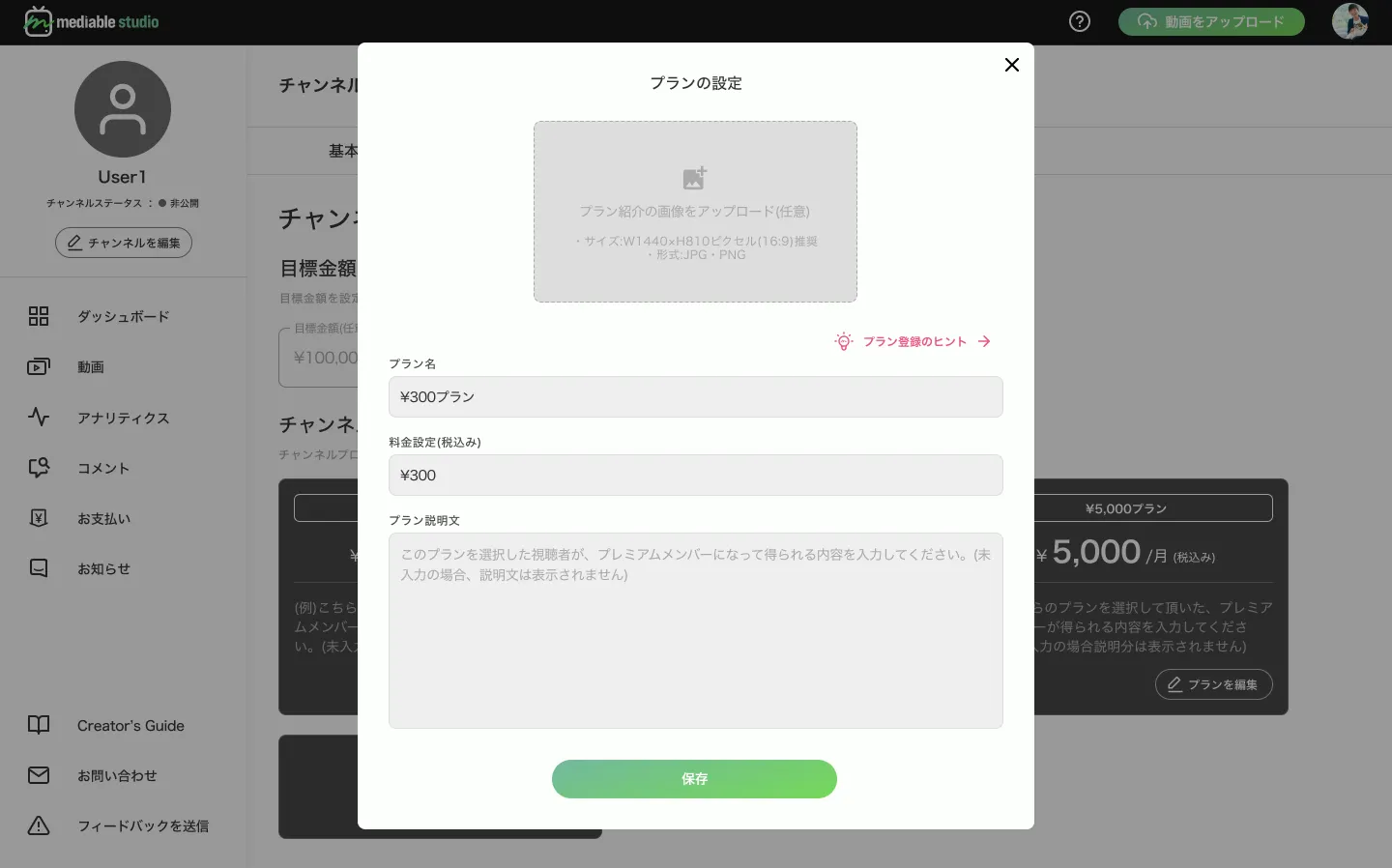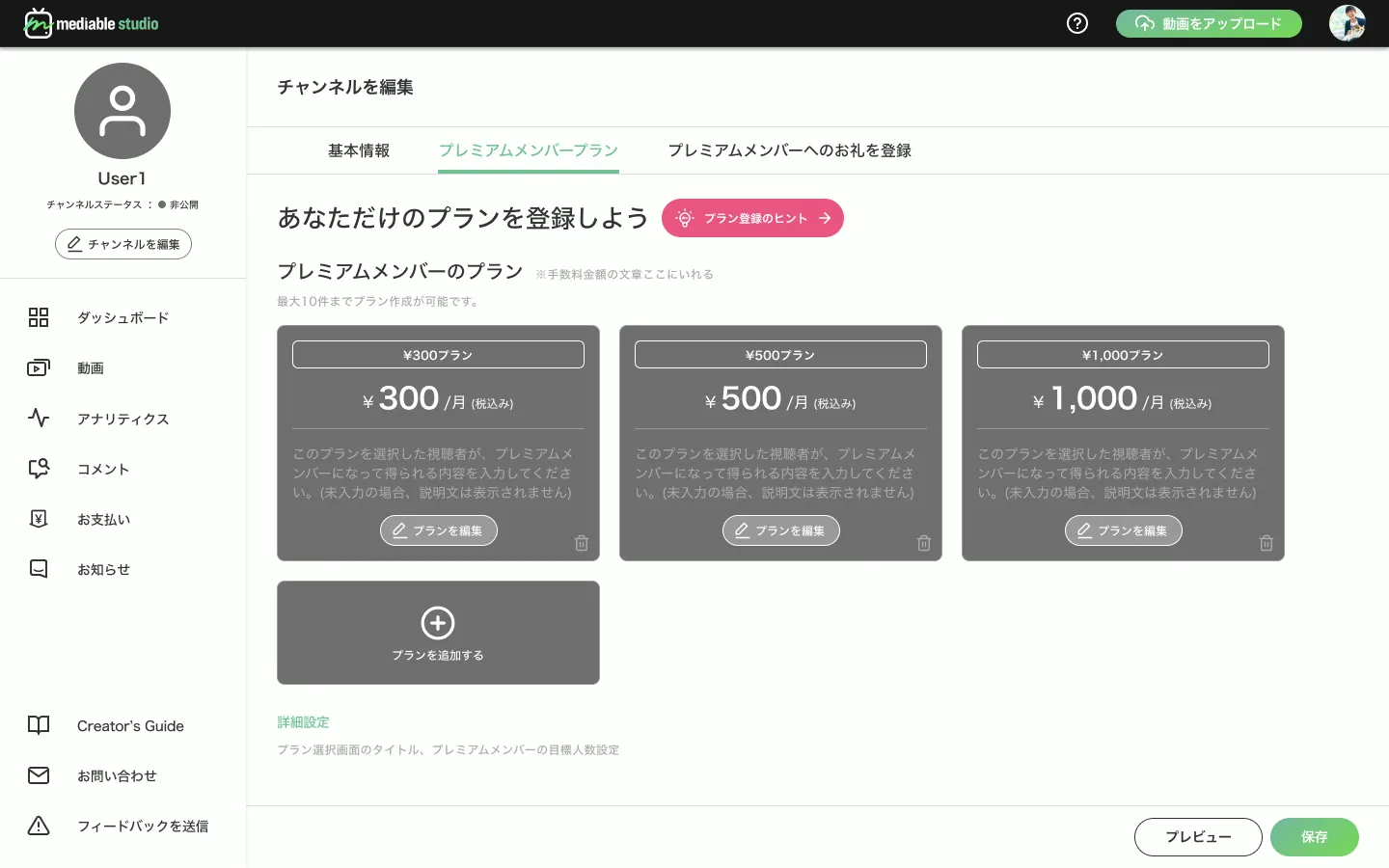 [設定画面 : mediable studioでプランを登録するとこのように見えます]