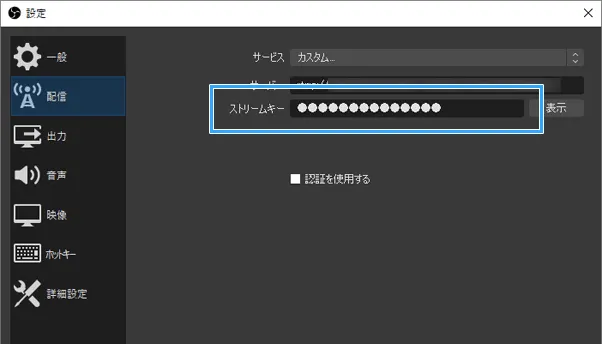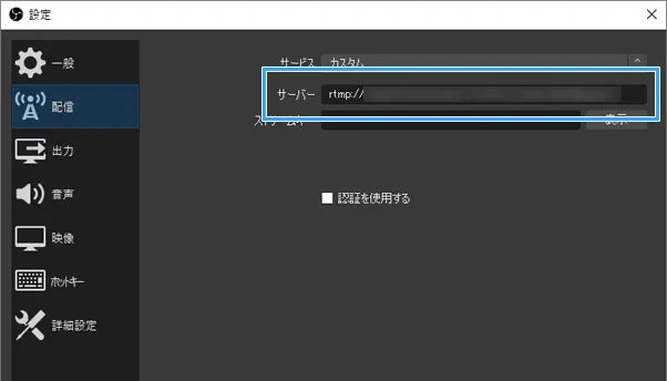 mediableの配信設定画面の「ストリームのURL」と「ストリームキー(エンコーダに貼り付け)」をそれぞれ、OBSの「サーバー」と「ストリームキー」にコピー&ペースト