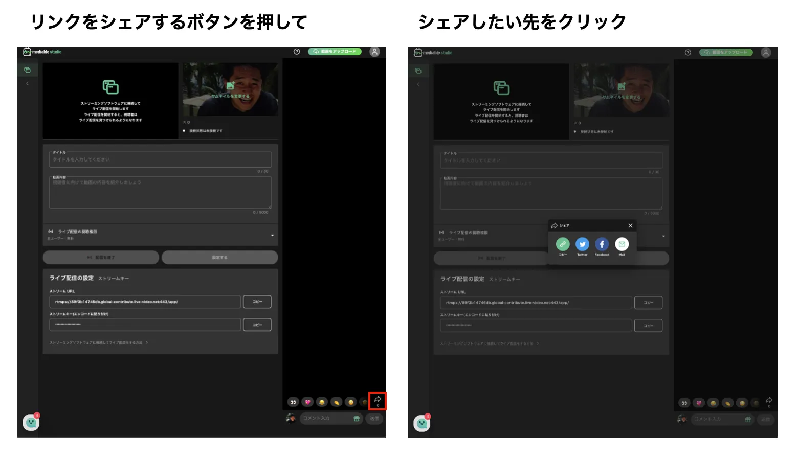 mediable studio上で「ライブ配信を開始する」をクリックし配信開始