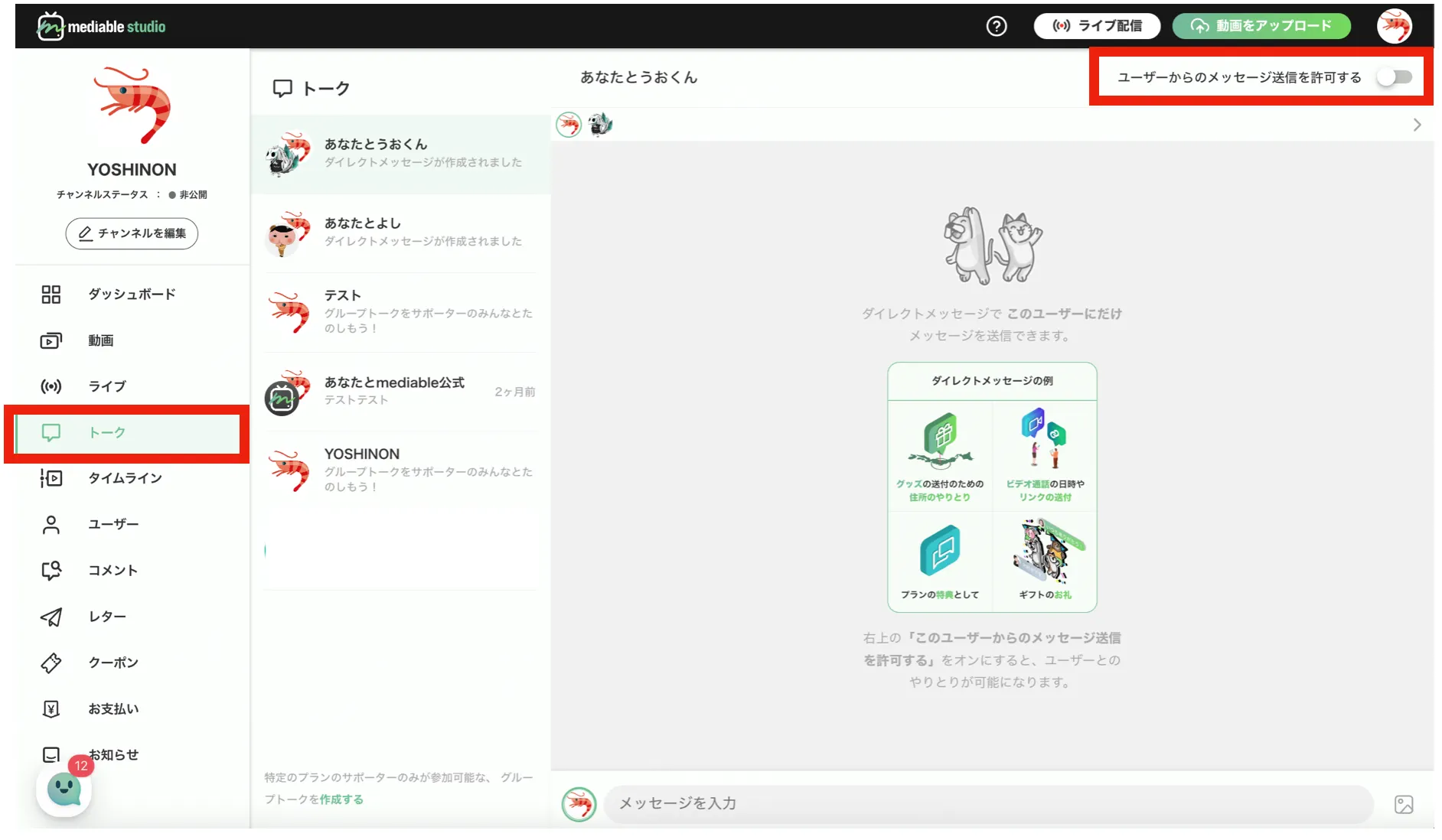 DMæ©èœã¯ã¯ãªãšã€ã¿ãŒãè¿ä¿¡ãèš±å¯ãããŠãŒã¶ãŒã®ã¿ã¡ãã»ãŒãžãéãããšãã§ããŸãã
